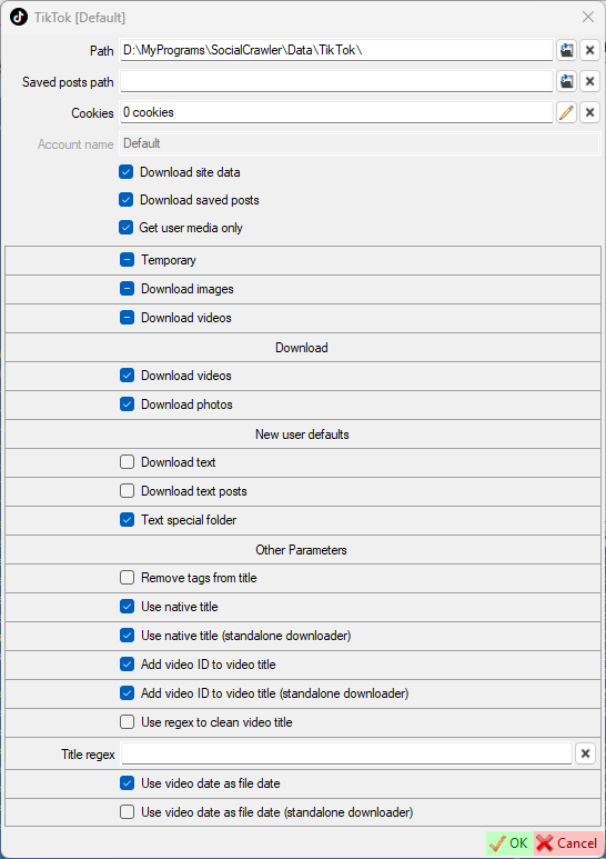 YT YouTubeSettings: add property 'DefaultSubtitlesEmbed' YouTubeMediaContainerBase: improve trim options; update command for 'DefaultSubtitlesEmbed' SCrawler TokenBatch, GDLBatch, YTDLPBatch: optimize code; add default encoding UserMedia: add property 'IsPhotoType' API.TikTok: optimize code; download descriptions API.Twitter: optimize code; fix downloading of site name, description and avatar API.Xhamster: add the properties 'UseYTDLPJSON', 'UseYTDLPDownload' and 'UseYTDLPForceDisableInternal'; add yt-dlp support; update parsing functions Groups, automation: delete 'Modes'; add groups downloading among other options; optimize code DownloadSavedPostsForm, DownloadProgress: add hotkey 'Esc' MainFrame: update 'BTT_VIEW_FILTER_LOAD_Click' function