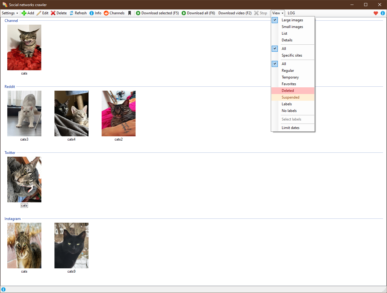 Parsing profiles descriptions (Reddit and Twitter) and updating it Filters: deleted, suspended, dates Collections containing deleted profiles are marked in blue Marked collection context elements Find profile in the main window from the info form New hotkeys in the info form: up, down, find, enter New hotkey in the main window: enter New list refill algo Added copying user pictures from all channels Changed view modes Changed comparer and ToString of UserDataBase New parameter added to channels stats (my users) Added view mode "details" Fixed twitter files overriding Fixed full parsing of reddit posts Fixed Insta timers and minors Fixed library fatal Removed UserDataBind comparer override Added GetUserMediaOnly for reddit users from channels Added Reddit availability check with DownDetector Added PLUGINS